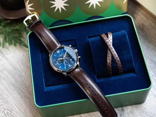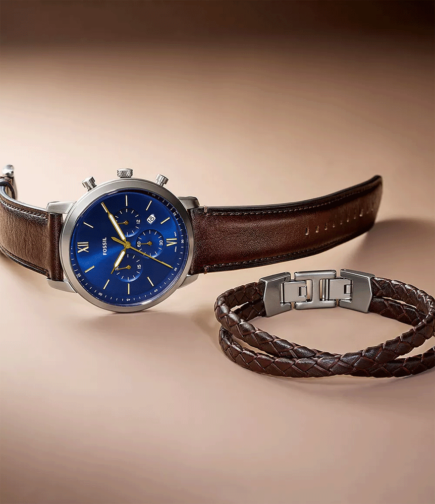 El reloj Fossil Set Brown/Blue es un set de hombre que incluye un reloj cronógrafo y un brazalete. A continuación de detalla sus características principales.
